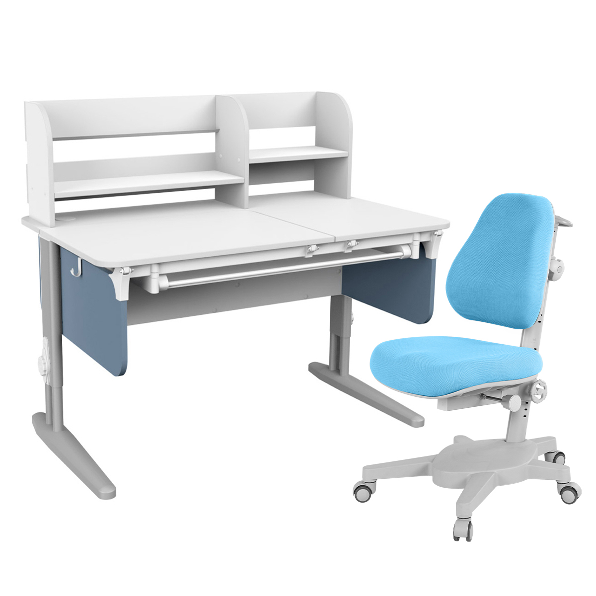 Комплект Дэми СУТ.62 PRO парта + кресло + надстройка + выдвижной ящик белый/лаванда/серый с креслом Armata голубой